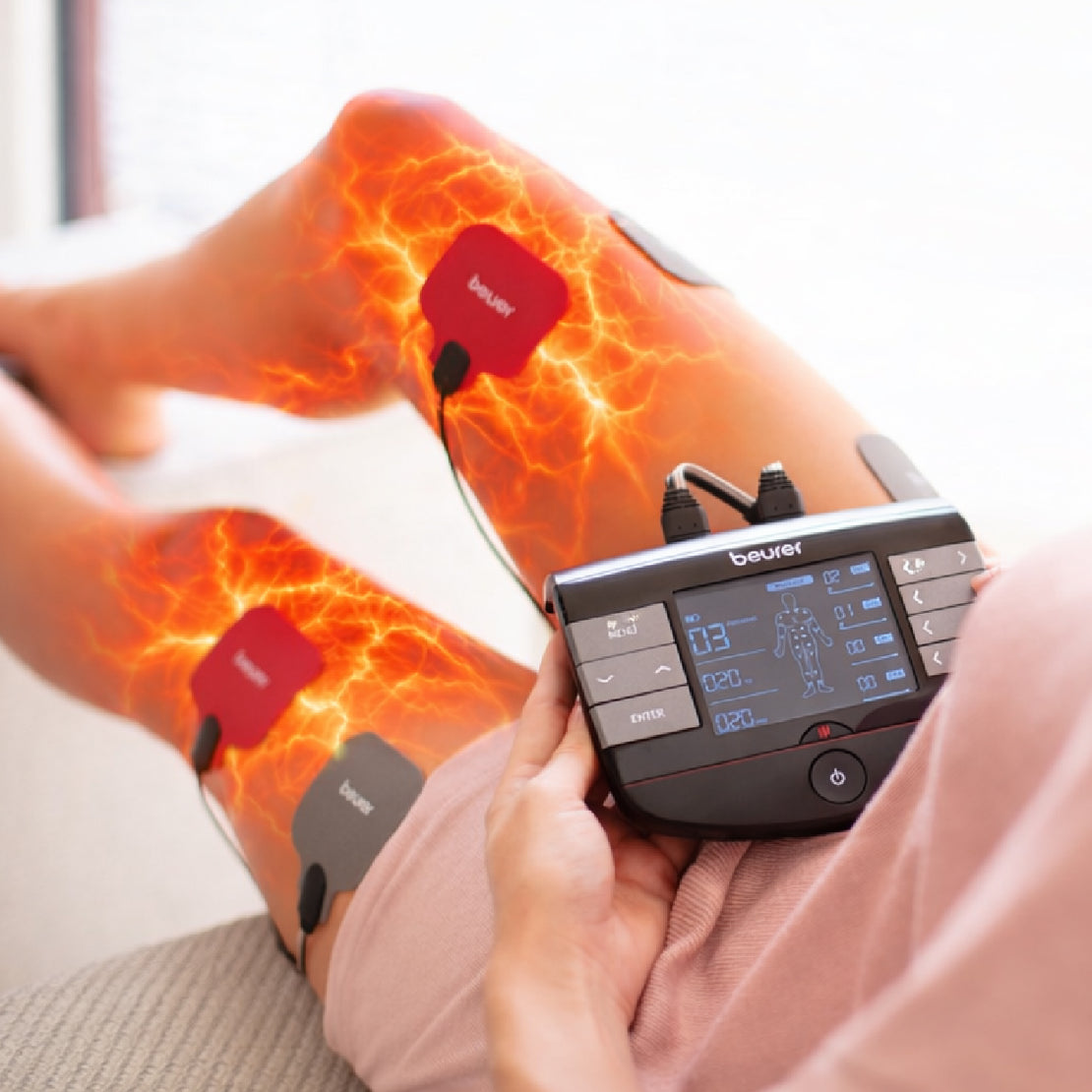 Electroestimulador muscular digital TENS/EMS EM41 con función de calor, 4 Electrodos y 64 aplicaciones, tiempo de encendido/apagado programable - Marca Beurer
