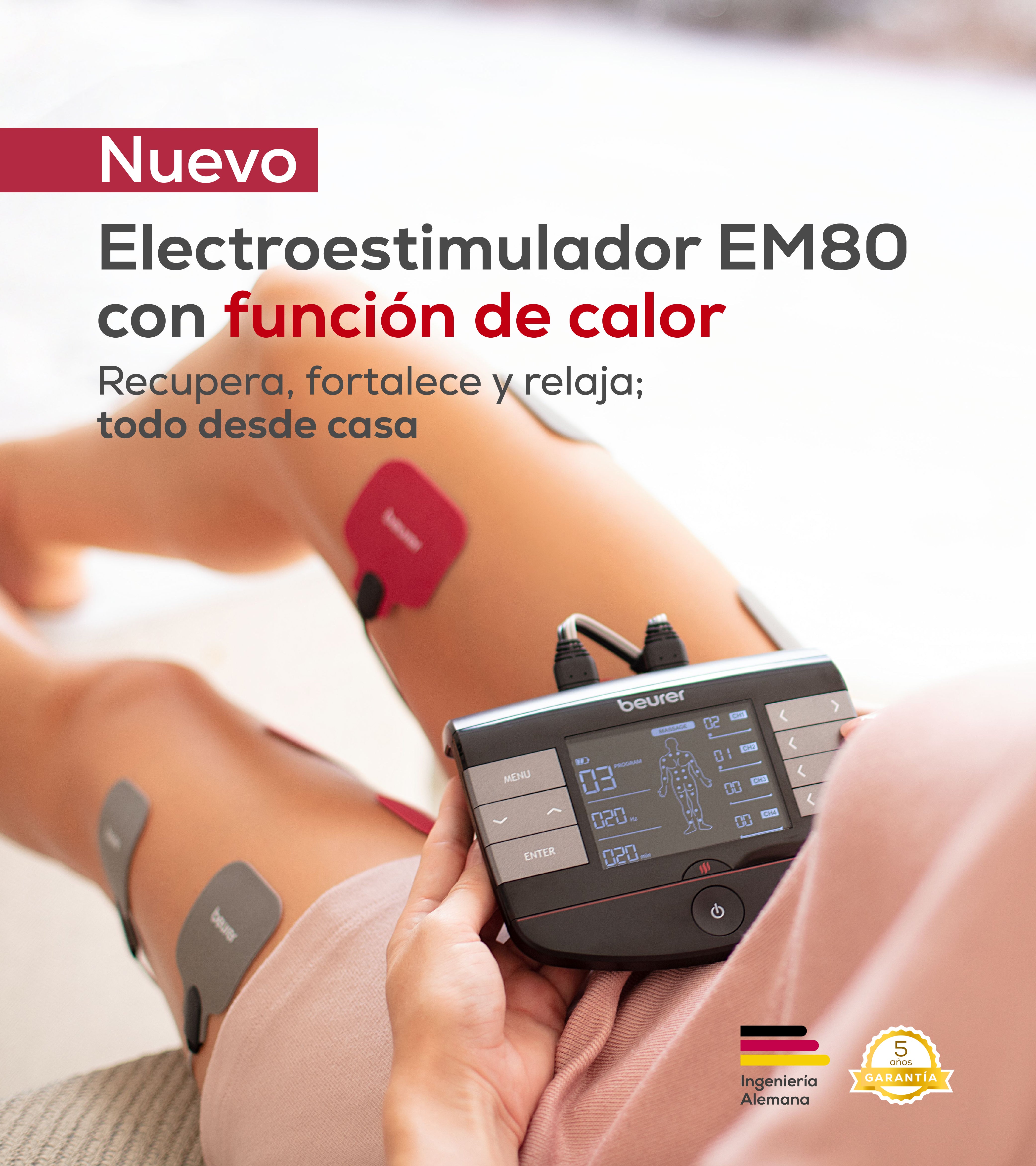 Electroestimulación muscular TENS/EMSElectroestimulador muscular digital TENS/EMS EM41 con función de calor, 4 Electrodos y 64 aplicaciones, tiempo de encendido/apagado programable - Marca Beurer