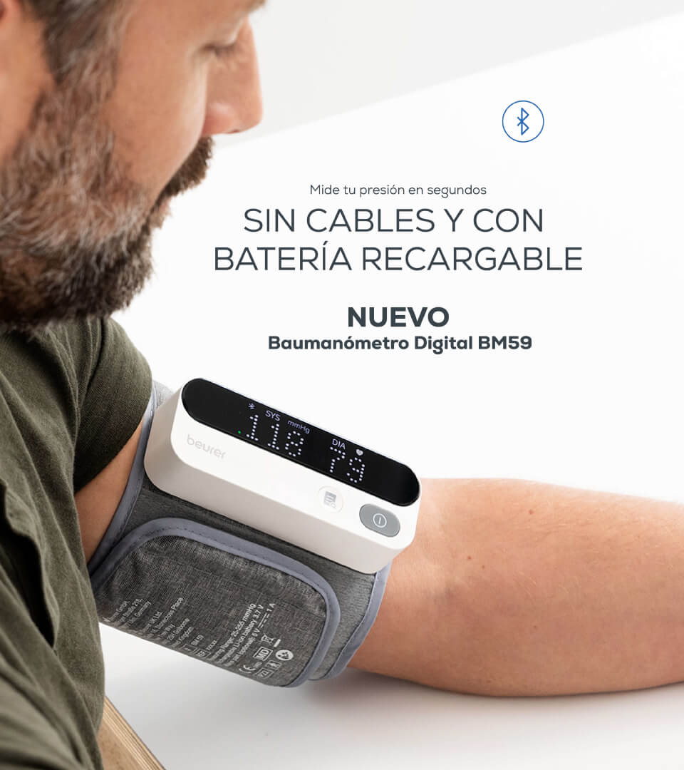 Presión arterialBaumanómetro digital de brazo recargable con indicador de riesgo LED, detección de arritmias, ideal para brazo de 22-42 cm con conexión bluetooth BM59 - Marca Beurer