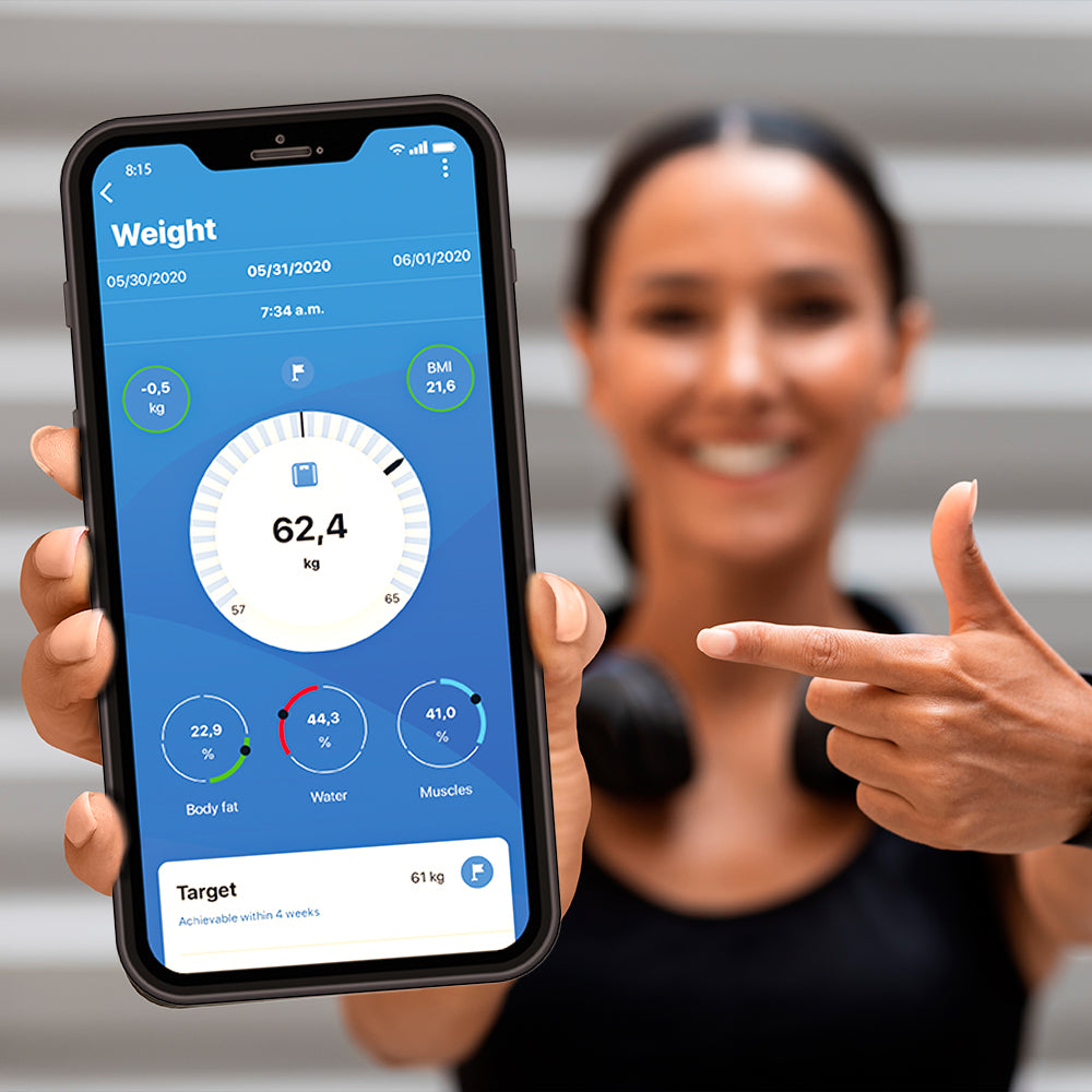 Visualiza a detalle cada uno de los parámetros que ofrece la báscula en tu smartphone a través de la App HealthManager Pro, así podrás compartirlos con tu nutriólogo y llevar un control completo de tu avance.