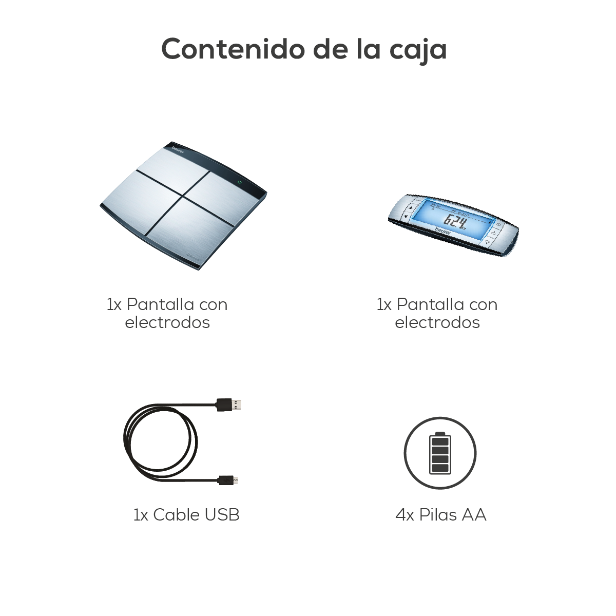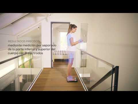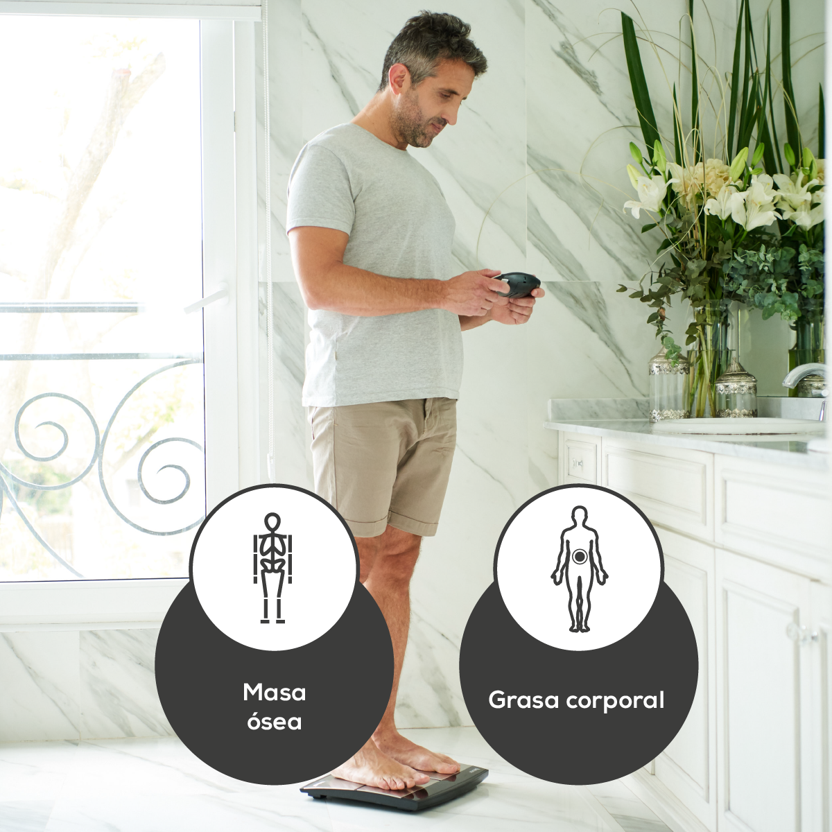 Peso, grasa corporal, agua corporal, masa muscular, masa ósea; indicación de calorías AMR/BMR.