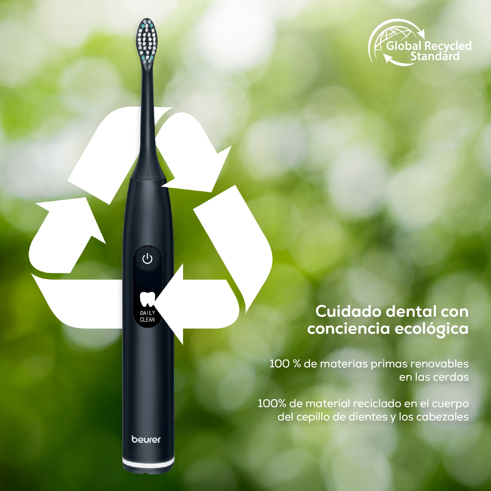 Hasta 80,000 oscilaciones/min, 5 modos de limpieza, sensor de presión y batería recargable de hasta 22 días, con base de carga y cabezales intercambiables. Fabricado con materiales reciclados.