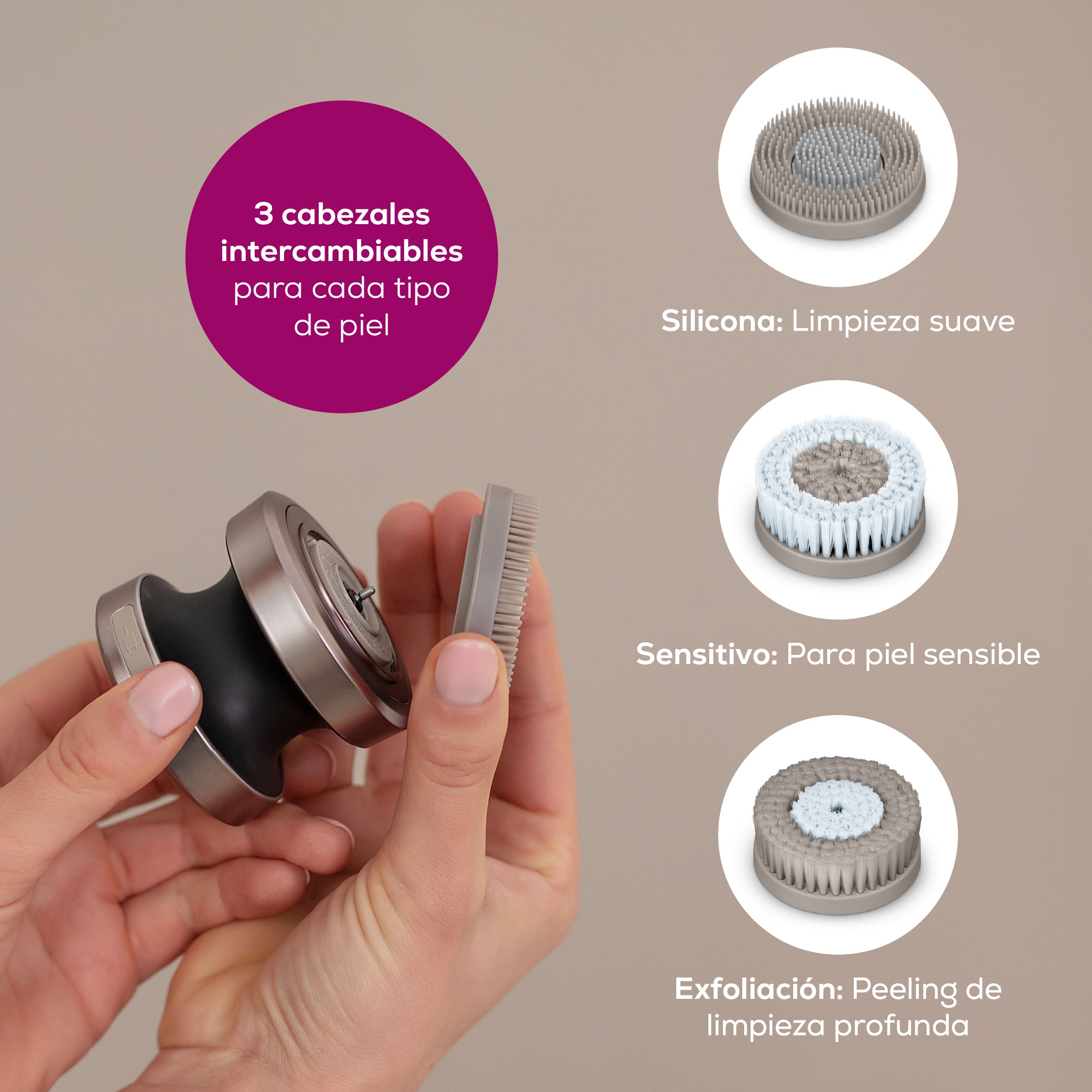 Cepillo eléctrico con cabezales giratorios que elimina impurezas y maquillaje hasta 4 veces más que la limpieza manual, dejando tu piel suave y radiante.
