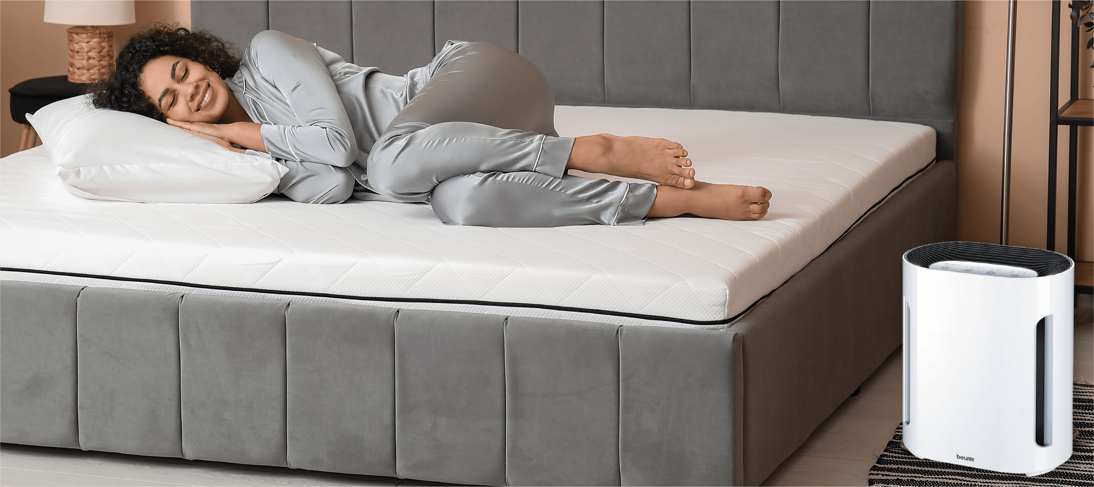 Duerme con aire y ambiente limpio. Con el purificador de aire con modo nocturno podrá disfrutar del aire ambiente adecuado en su hogar. Ya sea en el dormitorio, el salón o en otras habitaciones, el sistema de filtros mantiene limpio el aire filtrando una gran cantidad de virus y bacterias presentes en el aire.